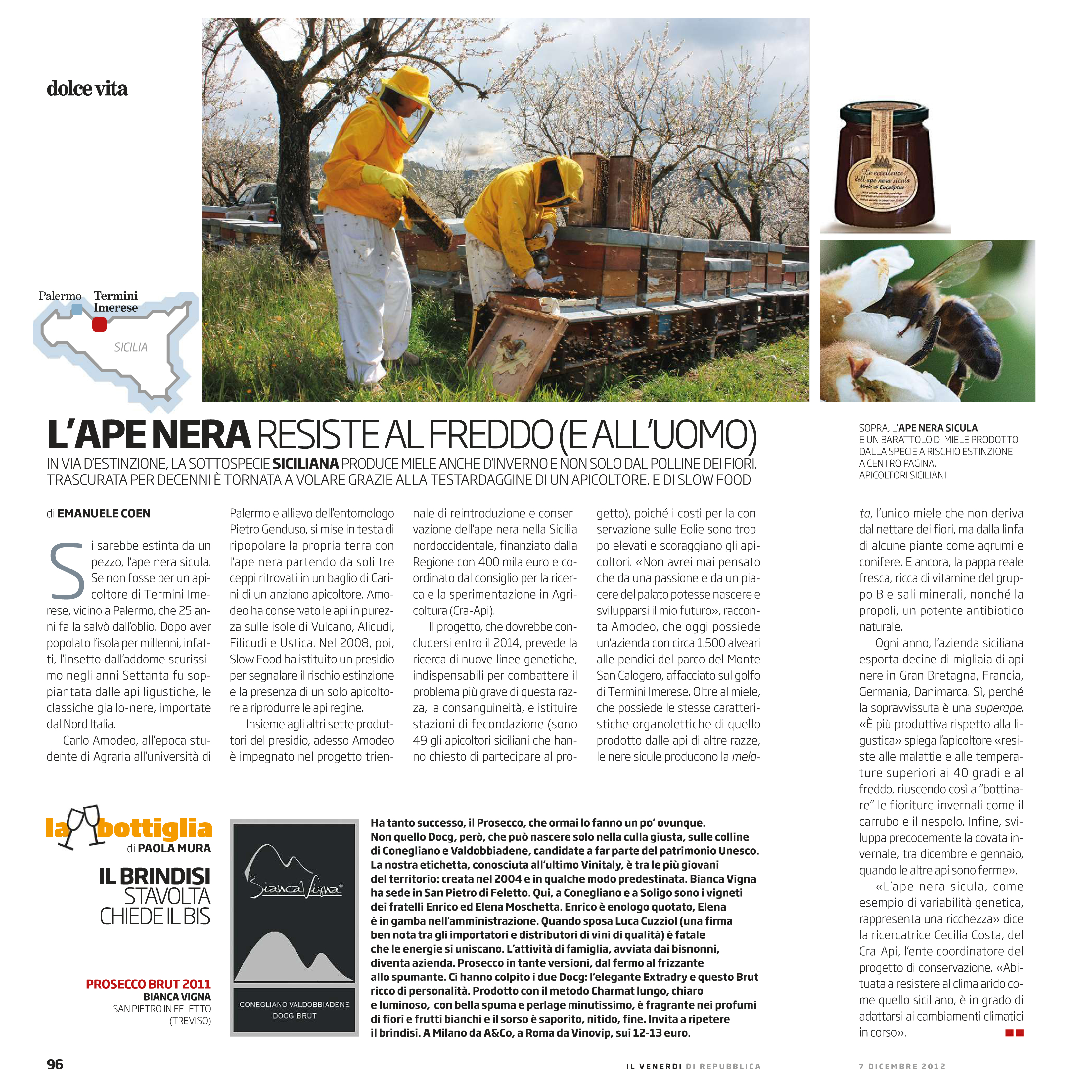 Il progetto, che dovrebbe concludersi entro il 2014, prevede la ricerca di nuove linee genetiche, indispensabili per combattere il problema più grave di questa razza, la consanguineità, e istituire stazioni di fecondazione (sono 49 gli apicoltori siciliani che hanno chiesto di partecipare al progetto), poiché i costi per la conservazione sulle Eolie sono troppo elevati e scoraggiano gli apicoltori. «Non avrei mai pensato che da una passione e da un piacere del palato potesse nascere e svilupparsi il mio futuro», racconta Amodeo, che oggi possiede un’azienda con circa 1.500 alveari alle pendici del parco del Monte San Calogero, affacciato sul golfo di Termini Imerese. Oltre al miele, che possiede le stesse caratteristiche organolettiche di quello prodotto dalle api di altre razze, le nere sicule producono la melata, l’unico miele che non deriva dal nettare dei fiori, ma dalla linfa di alcune piante come agrumi e conifere. E ancora, la pappa reale fresca, ricca di vitamine del gruppo B e sali minerali, nonché la propoli, un potente antibiotico naturale.